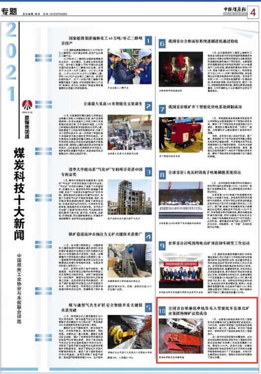 《全國首臺柴油機單軌吊無人駕駛機車在淮北礦業集團楊柳礦試驗成功》入選“2021煤炭科技十大新聞”