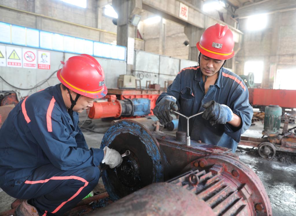 機電科職工宋佳芳和張連玉正在維修耙矸機齒箱?!岸嘈抟慌_設備,就能節省一點費用,也能為礦井修舊利廢工作出把力。”兩人堅定地表示。