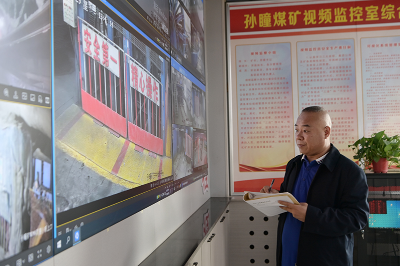在該礦視頻監(jiān)控室,面對6塊監(jiān)視大屏的24個作業(yè)點,安監(jiān)員王建兩眼來回逡巡,緊盯屏幕,認(rèn)真觀察每一個作業(yè)場所的規(guī)范作業(yè)情況,時而在隱患登記簿上記錄,時而拿起電話聯(lián)系,為礦井守好安全生產(chǎn)的第一道關(guān)口忙得不亦樂乎。