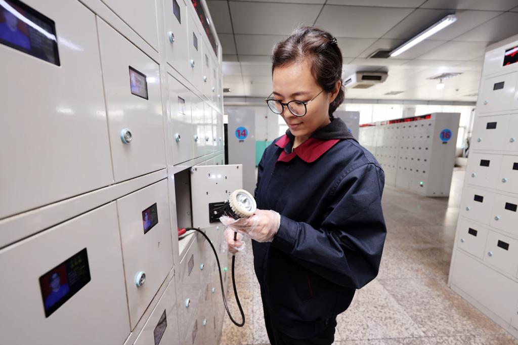 圖為該礦保運區(qū)燈房女工王方正在檢查礦燈充電情況。