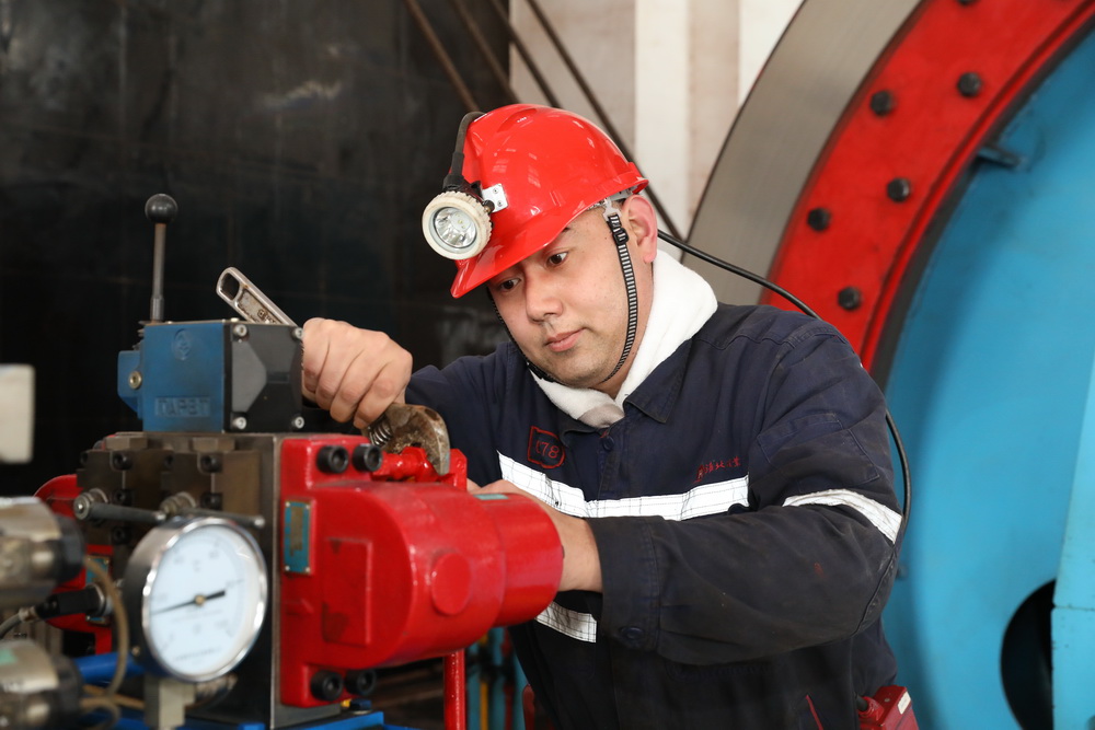 該礦保運區(qū)職工王飛進(jìn)行提升液壓站日檢。