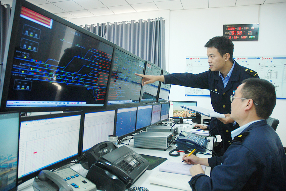 圖為湖集中心站行車室主任王迪現(xiàn)場盯控運輸組織作業(yè)