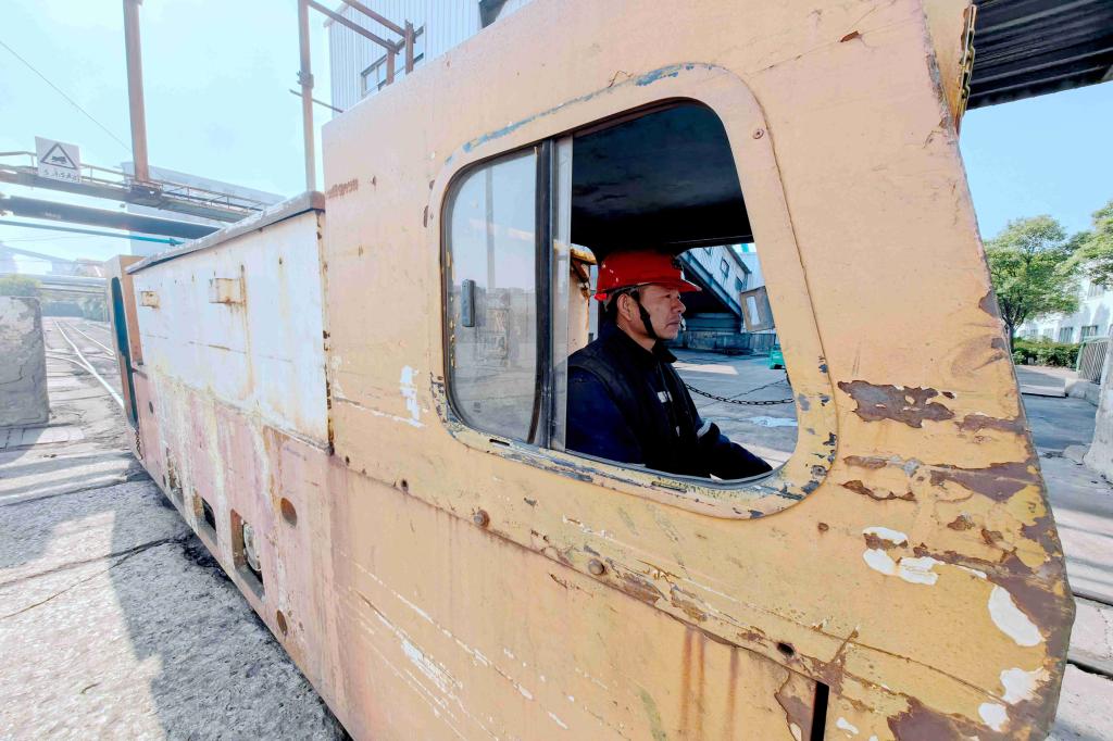圖為運輸區(qū)電機(jī)車司機(jī)劉召正在拉運即將入井的物料