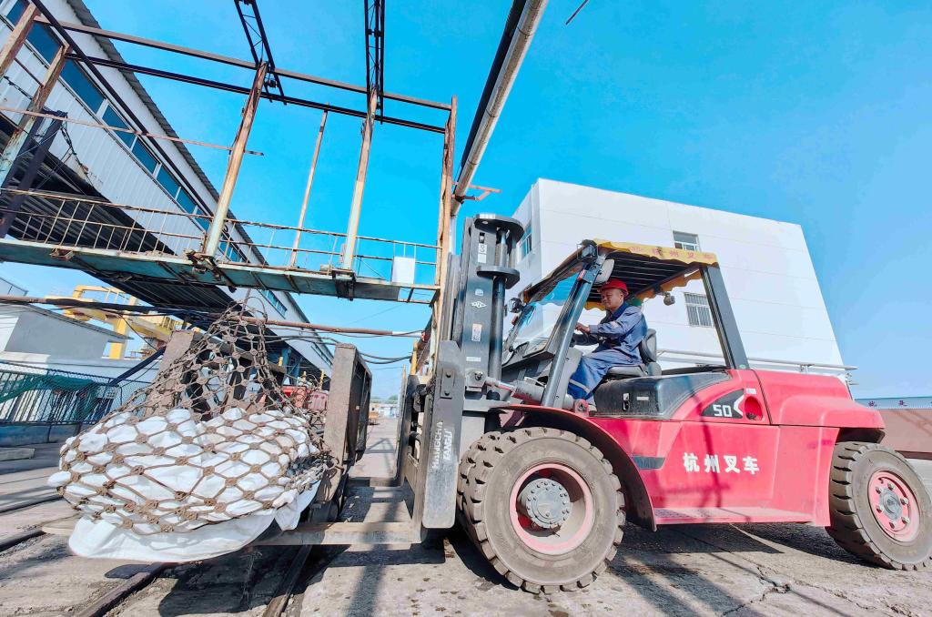 圖為運輸區(qū)叉車司機(jī)張振正在叉運物料