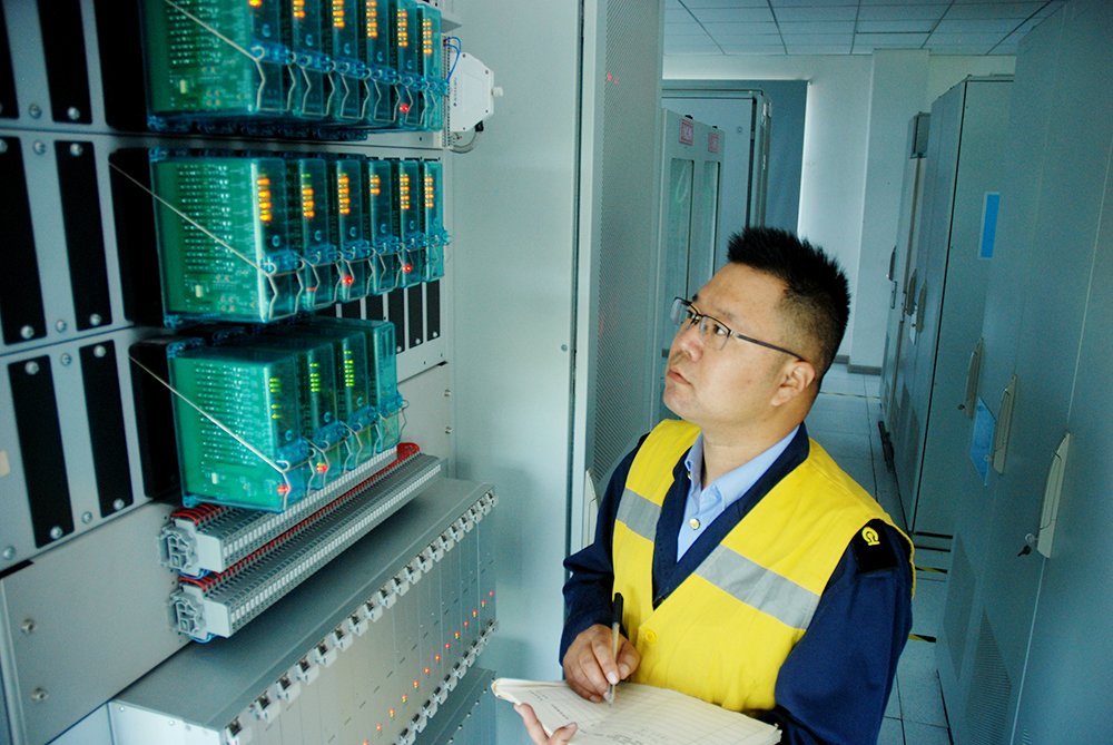 圖為臨渙電務(wù)段信號領(lǐng)工區(qū)領(lǐng)工長石磊查看信號聯(lián)鎖機(jī)房信號集中監(jiān)測系統(tǒng)運行情況