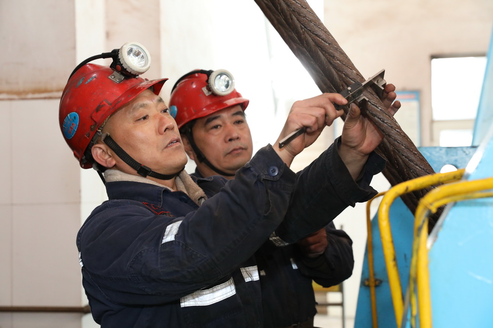 該礦保運區(qū)職工宋清杰(左)與工友查驗主提升鋼絲繩。