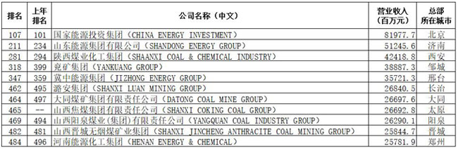 從中國上榜煤炭企業看,共有11家企業上榜,較上年凈增1家,山西焦煤集團再次進入500強名單。國家能源集團、山東能源集團、陜煤集團繼續位列煤炭行業入圍企業三甲,兗礦集團超過冀中能源集團位列第四位,且其成為排名上升最快煤炭企業(上升81位)。11家企業中,國家能源集團,晉煤集團位次略有下滑,其余企業排名位次均有所提升。
