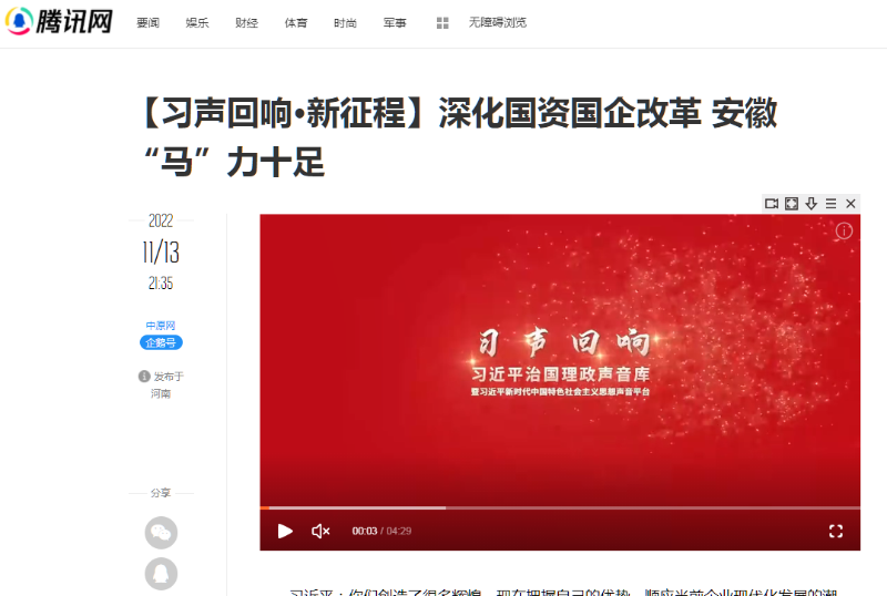搶抓發展機遇,敢為時代先鋒。國企改革三年行動以來,安徽國資國企深化改革創新,不斷轉型突破,推動省屬企業高質量發展邁上新臺階。2021年,安徽省屬國有企業經營業績創歷史最好水平。今年上半年,省屬企業資產總額首次突破2萬億元。目前,安徽省國企改革三年行動的129項重點任務已基本完成。央廣網、人民網、中國網、中華網、光明網、環球網、中國經濟網、中國青年網、中青在線、新浪網、網易網、騰訊網、搜狐網、鳳凰網等15家全國主流媒體及30余家省級主流媒體對此進行了集中報道。