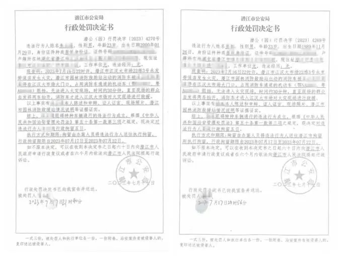 2023年7月,湖北潛江一市場(chǎng)門(mén)面房夜間發(fā)生火災(zāi),兩輛私家車(chē)違規(guī)停在消防通道上,違停車(chē)輛車(chē)主不能及時(shí)到場(chǎng),致使消防救援車(chē)輛無(wú)法進(jìn)入,情急之下,現(xiàn)場(chǎng)群眾合力將違停車(chē)輛抬離。相關(guān)部門(mén)對(duì)兩位私家車(chē)主均處以行政拘留五日的處罰。